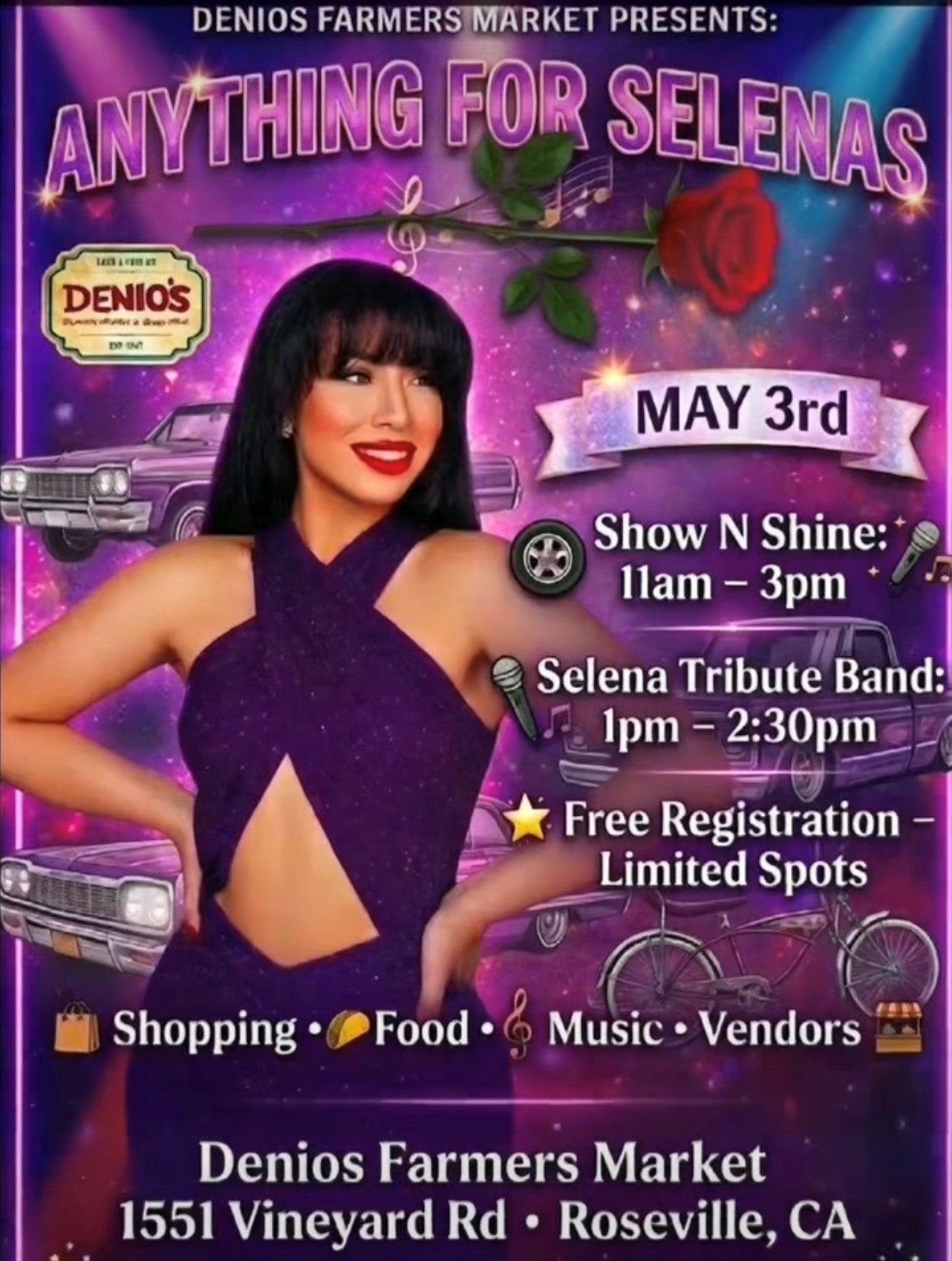 Join us as AllStars916 & Low And Slow Estilo Presents “Anything for Selenas Tribute Show & Shine.” This show is open to the first 50 vehicles and builds to enter. This event takes place the same day as the “Anything For Salinas- A Tribute to Selena” concert at Market Plaza Live! Come and celebrate the Queen of Tejano Music all day only at Denio’s!