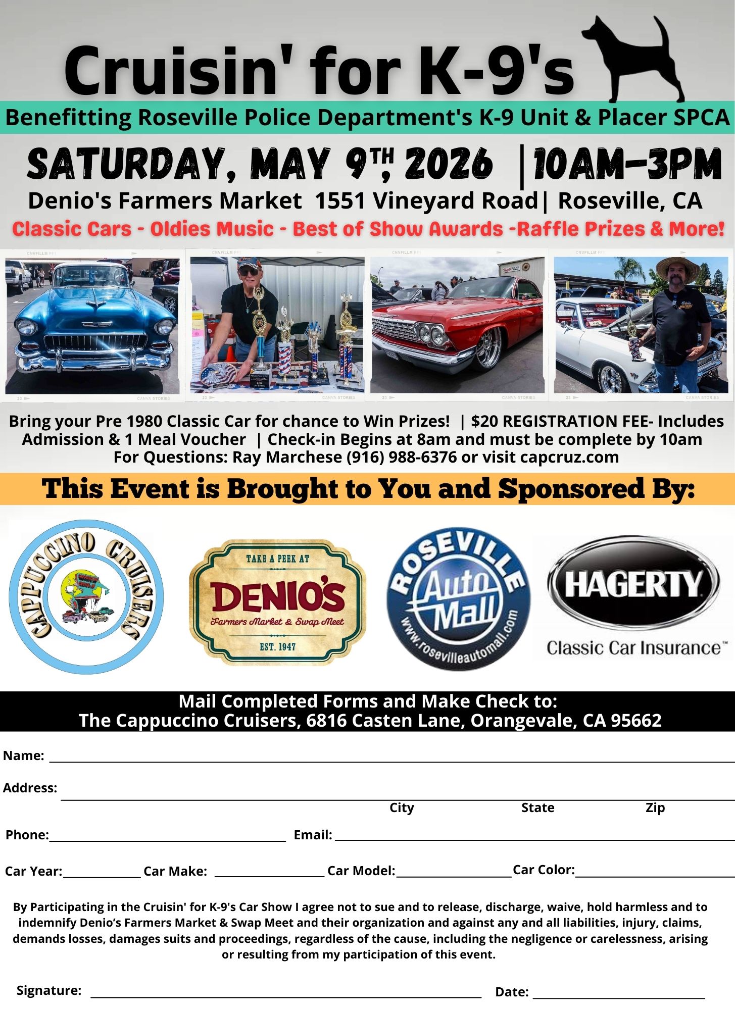 Get ready to cruise into the past. Join the Cappuccino Cruisers as they host their annual Cruisin’ for K-9’s Car Show benefitting the Roseville Police Department’s K-9 Unit and the Placer SPCA. Bring your pre 1980 Classic Car or come out and enjoy classic cars!