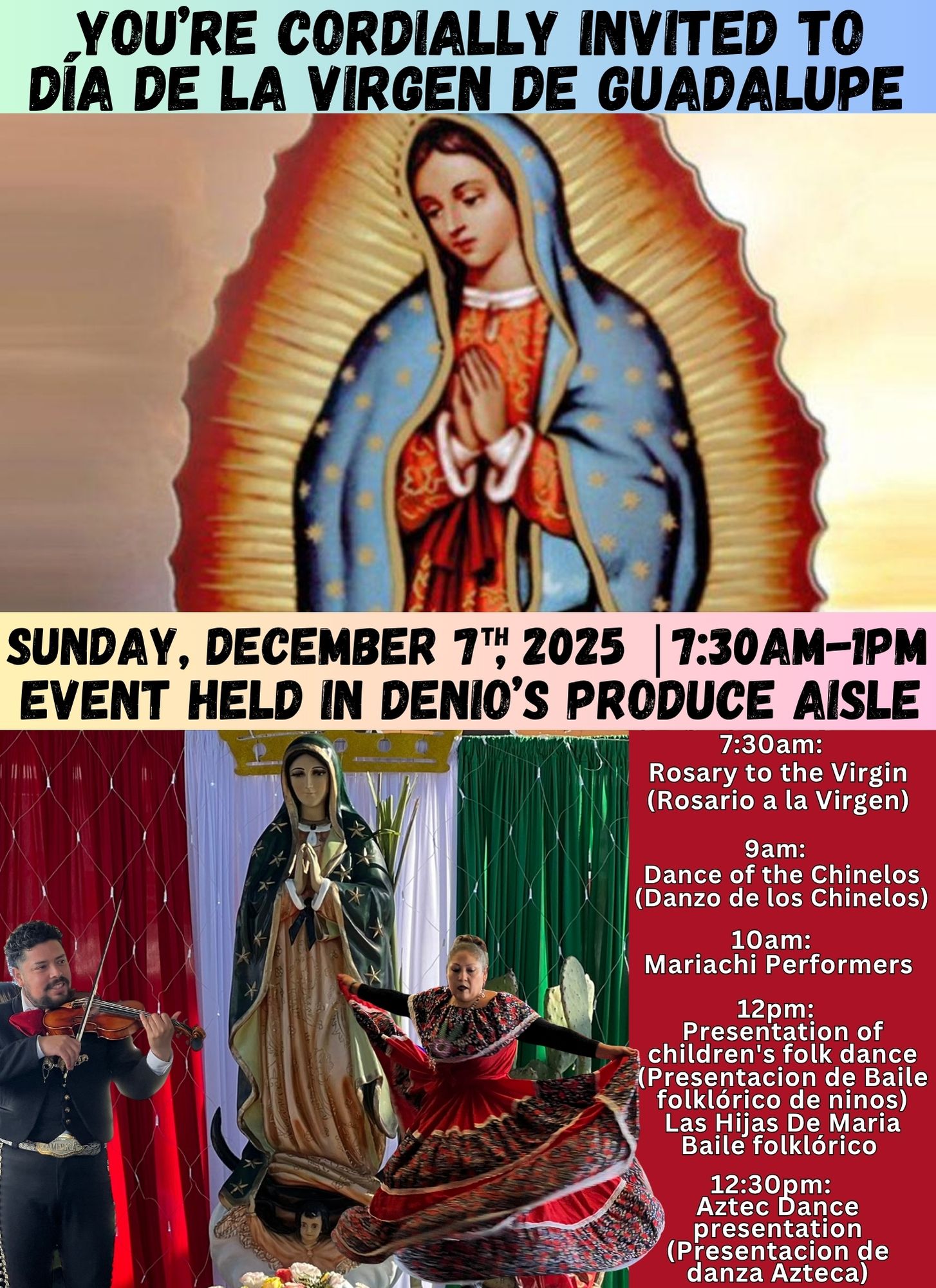 Join our produce vendors as they host their annual Día de la Virgen de Guadalupe. This national holiday, honors Our Lady of Guadalupe, a Catholic Saint that is very important for faithful Mexican citizens. Enjoy Mexican pastries, Mariachi’s, dancers and more! This event is proudly brought to you by the Denio’s Farmers Market produce vendors and will take place in the South Produce entrance.