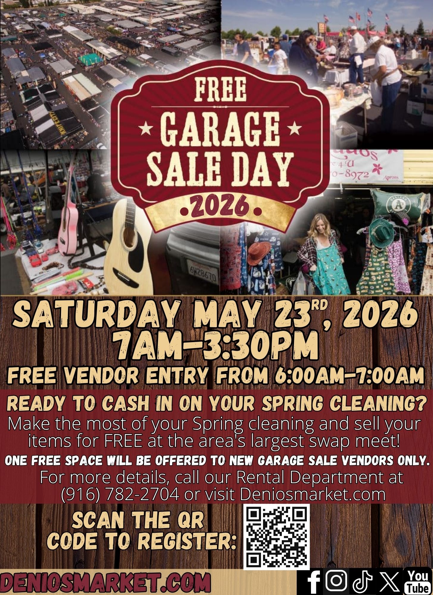 Turn your spring cleaning into cash! Clear out the clutter and sell your items for FREE at the area’s largest swap meet. Join us for FREE Garage Sale Day on Saturday, May 23rd where new garage sale vendors can claim ONE free selling space! For more details, call our Rental Department at (916) 782-2704 or visit Deniosmarket.com. Click the link to register.