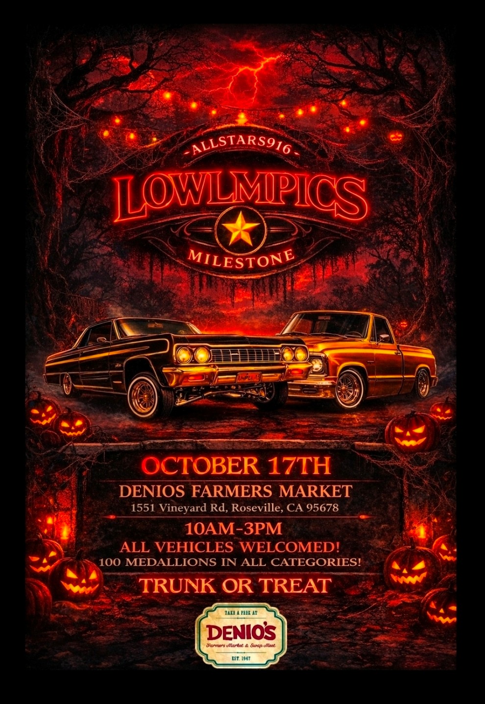AllStars916 presents the Lowlympics Trunk or Treat event. This show is open to all vehicles and builds. Solo riders and car clubs are also welcomed. Over 100 medallions will be awarded over all categories. All families and kids of all ages are welcome!